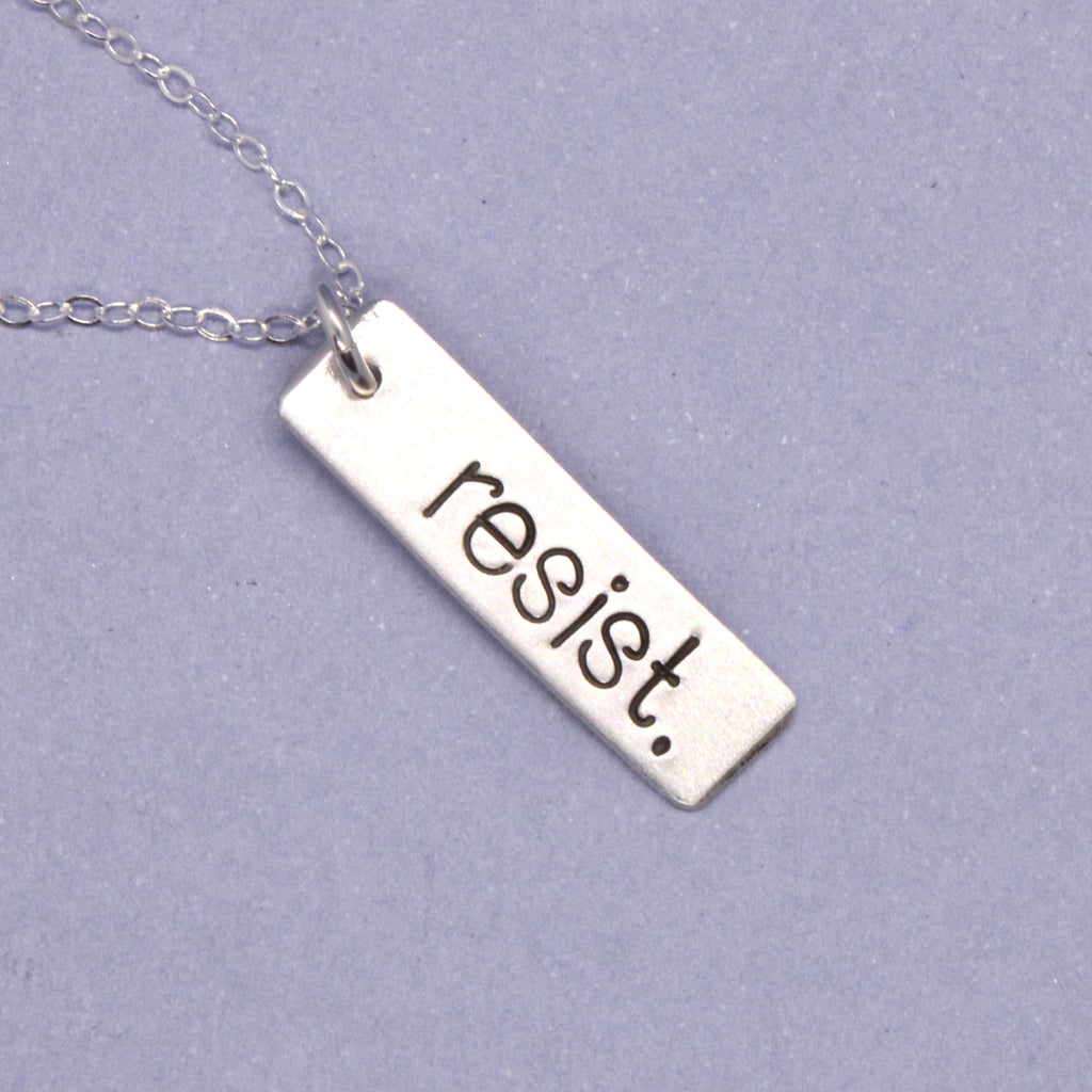 Wear your strength close to your heart with this minimalist sterling silver pendant hand-stamped with the word "resist."Whether you're standing up for what you believe in or gifting someone who inspires you, this piece is a subtle yet powerful reminder of resilience and courage.