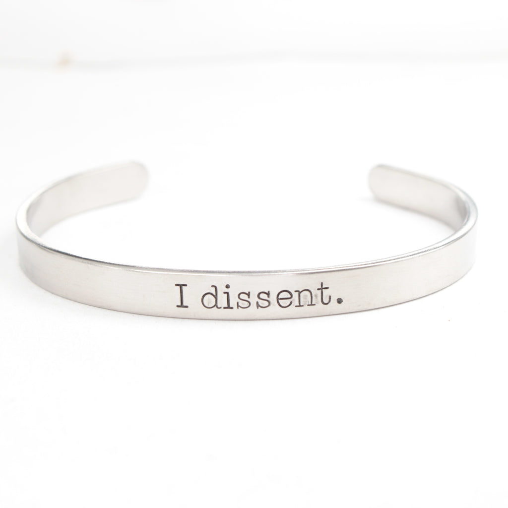 This light, yet sturdy, 1/4 inch wide cuff bracelet is stamped with "I dissent."